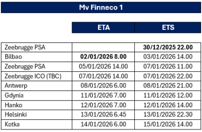 MS Finneco 1 – Updated departure from Zeebrugge and ETA Bilbao