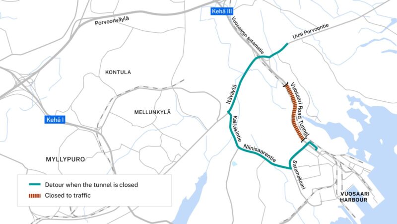Der Straßentunnel, der zum Hafen Vuosaari in Helsinki führt, wird von Anfang 2026 bis voraussichtlich Anfang 2027 umfassend saniert. Während der Arbeiten bleibt der Tunnel vollständig gesperrt.