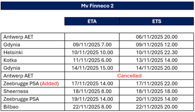 Please be advised that the M/V Finneco 2 will no longer call Antwerp on November 17th and will instead call Zeebrugge.